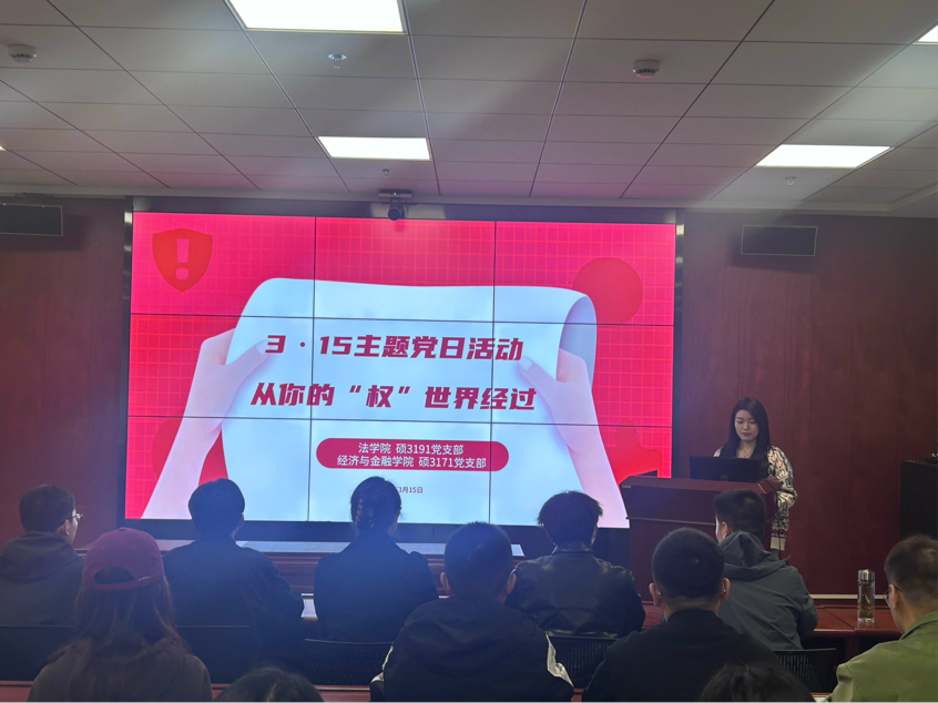 每年的3月15日,是由国际消费者联盟组织于1983年确定的国际消费者权益日(World Consumer Rights Day)。为提高同学们对消费者权益保护的认识,增强其在消费中利用法律手段维护自身权益的意识和能力,时博手机平台_时博(中国)硕3191党支部联合经济与金融学院硕3171党支部,于3月15日19:00在创新港校区涵英楼3001教室开展3·15主题党日活动。本次活动由时博手机平台_时博(中国)硕3191党支部书记刘芮言主持,活动主要内容为消费者侵权研究分享。