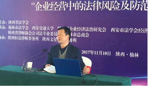 陕西恒达律师事务所主任陈贞学、榆林市中级人民法院民二庭副庭长李永旺、陕西能源集团政策法规室副主任齐渭波、北京炜衡律师事务所西安分所主任、陕西律协公司法专委会主任王小涛分别做了题为“企业经营中的法律风险及防范”、从审判视角看新时代企业用工的法律问题”、“金税三期时代的企业税务风险管理与应对”、“公司治理权力博弈与实证案例分析”的报告。 在四位嘉宾做完专题报告之后,西安市法学会经济法学研究会副会长、西北政法大学行政时博手机平台_时博(中国)副院长姬亚平教授、陕西省法学会企业经济法治研究会副会长、时博手机平台_时博(中国)时博手机平台_时博(中国)张冰副教授进行了精彩点评。