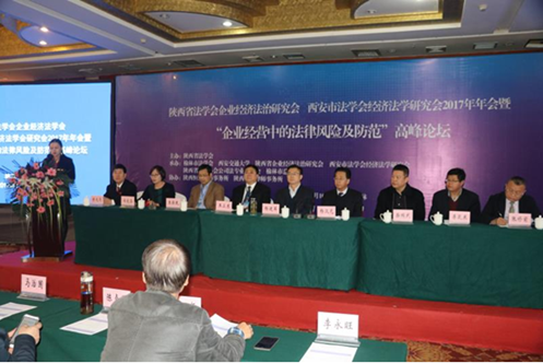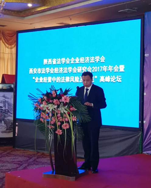 2017年11月10日,由陕西省法学会主办,榆林市法学会、时博手机平台_时博(中国)、陕西省法学会企业经济法治研究会、西安市法学会经济法学研究会、陕西省律师协会公司法专业委员会、榆林市总商会共同承办的陕西省法学会企业经济法治研究会、西安市法学会经济法学研究会2017年年会暨“企业经营中的法律风险及防范”高峰论坛在榆林隆重召开。陕西省法学会专职副会长杨建军、陕西省律师协会副会长王卫东、时博手机平台_时博(中国)时博手机平台_时博(中国)党总支书记王保民、榆林市委政法委常务副书记杨汉元、榆林市法学会副会长柴瑞武、榆林市政府法制办副主任李芝东、榆林市中级人民法院审委会专职委员李光亮、榆林市工商业联合会副主席、市总商会副会长张修前莅临本次会议并发表讲话。各界代表180余人参加会议。