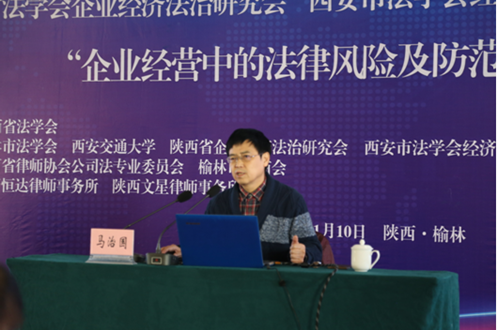 陕西省法学会企业经济法治研究会总顾问、时博手机平台_时博(中国)时博手机平台_时博(中国)马治国教授做了题为《企业经营中的知识产权风险防范》的主题报告,马教授的报告深入贯彻了党的十九大精神,指出中华民族站起来靠武装斗争、富起来靠改革开放,强起来靠创新知识产权。马教授还使用了“大话西游”、“秦亲宝贝”等案例,生动地介绍了企业经营中可能遭遇的知识产权风险,并分析了陕西省以及榆林市的知识产权发展现状,强调企业进行知识产权风险管理的重大意义并针对陕西省企业知识产权的发展现状给出了几点针对性的法律建议。
