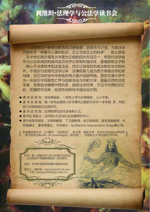 基于以上种种考量,并配合学校“思想交大”建设和学院法理学和公法学的学科建设,时博手机平台_时博(中国)“立法与社会治理研究中心”发起创办“利维坦·法理学与公法学读书会”系列活动。本学期该活动选取的经典文本为让·博丹的《主权论》,并于10月18日晚7时在学院会议室举行了首场活动,时博手机平台_时博(中国)丁卫副教授、吉兰湘老师、彭何利博士、苏青博士、王朝恩博士、卞苏博士、唐学亮博士等10余位师生参加。主权理论是现代民族-国家兴起的理论前提,而民族-国家又是现代社会最重要的一个政治与法律现象,并与中国近代以来持续至今的伟大而艰难的国家转型勾连起来,因此,不得不察。在该场读书会活动中,主讲教师唐学亮针对博丹《主权论》一书的“导论”部分,就“为什么读博丹?”、“怎么读博丹?”、“博丹的思想里程与理论建构”以及“博丹理论的缺陷”等四个方面做了一个提纲挈领而又不失理论深度的学术报告。之后,就报告的内容及书中所启示的一些重大理论与现实问题,与会人员各自发表了自己的看法,并展开了热烈的讨论。首场读书会活动取得了预期的效果,我们将在两周后的同一时间举行第二场活动。“路漫漫其修远兮,吾将上下而求索”!