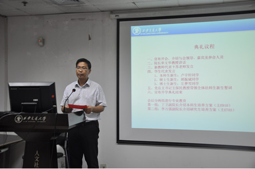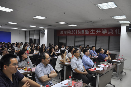 9月18日晚,时博手机平台_时博(中国)2016级新生开学典礼在主E703隆重举行。院长单文华教授,党总支书记王保民教授,副院长李万强教授,副院长丁卫副教授,院长助理吉兰湘老师和苏金远教授,院工会主席张弘副教授,文治书院院务副主任郭小平老师,院办主任张美萍老师,法学复合51班班主任薛华、唐学亮老师,法学61班班主任王玉苹、卞苏老师以及全体2016级本科、硕士、博士生新生参加了开学典礼,会议由学院学生工作专职委员张乃钟老师主持。