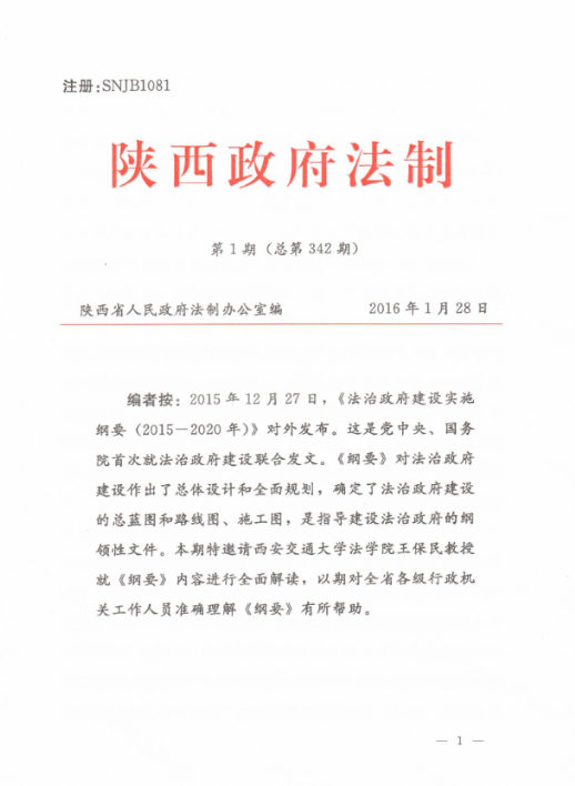 2015年12月27日,《法治政府建设实施纲要(2015-2020年)》对外发布。陕西省人民政府法制办公室邀请了时博手机平台_时博(中国)时博手机平台_时博(中国)王保民教授就《纲要》内容进行了全面解读,解读内容被采纳报省领导,送省属各机关,省法院、检察院,各市、县(区)人民政府,发各级政府法治工作机构,以期对全省各级行政机关工作人员准确理解《纲要》有所帮助。