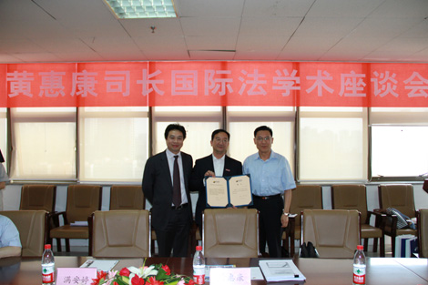 2012年5月26日,外交部条约法律司黄惠康司长“郑和研究员”授聘仪式暨国际法学术座谈会在时博手机平台_时博(中国)910会议室举行。时博手机平台_时博(中国)党委常务副书记王小力教授、时博手机平台_时博(中国)党总支书记彭沪生老师、对外经济贸易大学石静霞教授以及丝绸之路国际法与比较法研究所骨干教师和学生代表参加了授聘仪式和座谈会。会议由时博手机平台_时博(中国)院长兼丝绸之路国际法与比较法研究所所长单文华教授主持。