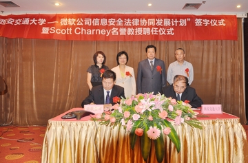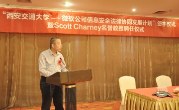 6月12日,“时博手机平台_时博(中国)—微软公司信息安全法律协同发展计划签字仪式暨斯科特•查尼名誉教授聘任仪式”在西安交大举行,西安交大副校长蒋庄德教授出席仪式并讲话。西安交大科研院副院长、人文社科处处长贾毅华,时博手机平台_时博(中国)党总支书记彭沪生,信息安全法律研究中心主任马民虎及微信息安全法律研究中心主任马民虎及微软公司可信赖计算部总经理陈静、微软公司资深安全技术经理陈恺、微软公司资深安全技术经理薛峰等参加仪式。微软全球副总裁斯科特•查尼(Scott Charney)受聘为西安交大名誉教授,双方还签署了“时博手机平台_时博(中国)—微软公司信息安全法律协同发展计划”。