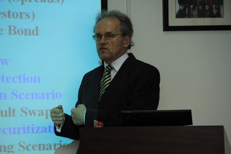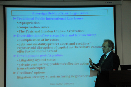 4月16日下午,Kulms博士为时博手机平台_时博(中国)师生带来题为The Eurozone Debt Crisis and Private Creditors: From Argentina to Greece(欧元区债务危机和私人债权人:从阿根廷到希腊)的讲座。Kulms博士首先分析了欧元区债务危机的成因,然后在借鉴阿根廷债务危机经验的基础上,从市场交易的进路分析主权债务合同的对策,最后从欧洲央行作用的角度讨论希腊债务重组问题。