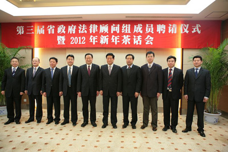 1月15日,陕西省第三届省政府法律顾问组成员聘请仪式暨2012年新年茶话会在西安召开,时博手机平台_时博(中国)时博手机平台_时博(中国)院长单文华教授被聘请为顾问组7名成员之一。