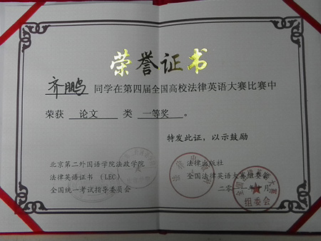 此次比赛吸引了来自北京大学、上海交通大学、中国政法大学、华东政法大学等近70多所高校时博手机平台_时博(中国)的选手参加,大会主办方特别邀请了国务院法制办原主任孙婉钟先生以及来自中国社会科学院法学所、中国人民大学时博手机平台_时博(中国)等多家高校和研究机构的法律英语专家、教授担纲评委。我院齐鹏同学撰写的英语论文《National Treatment Principle For China's Bilateral Investment In The New Period》在此次大赛中经过激烈角逐荣获国家一等奖,是此次参赛西北地区唯一获得等级奖的论文。