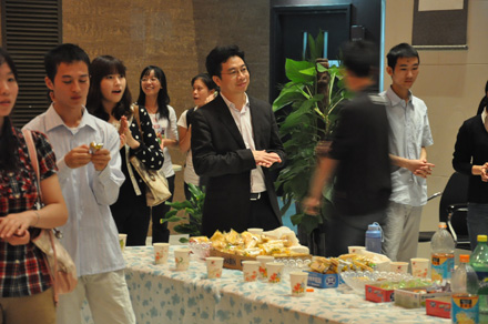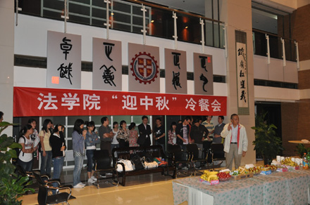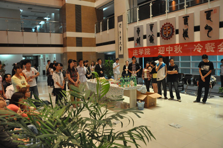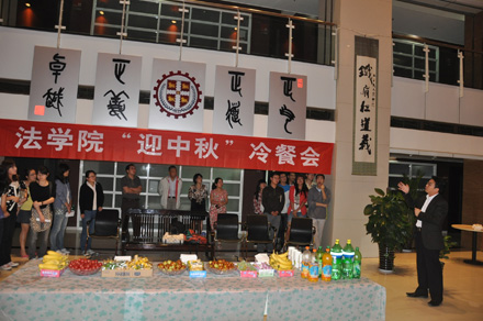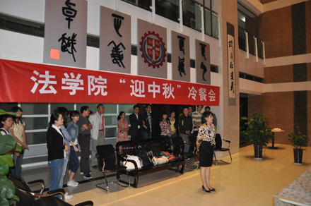 2011年9月8日19:30,时博手机平台_时博(中国) “迎中秋”冷餐会在主楼十楼大厅举行。时博手机平台_时博(中国)院长单文华、书记彭沪生、院长助理吉兰湘、刘桥教授和学生工作专职委员张乃钟老师及时博手机平台_时博(中国)2011级全体本科生,硕士、博士研究生新生参加了冷餐会。冷餐会由2011级法律硕士新生马沙和马骏飞同学主持。