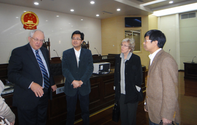 3月25日,安德森大法官及其夫人在我校时博手机平台_时博(中国)副院长王保民带领下参观了陕西省高级人民法院,省高院田平利副院长出面迎接,并亲自带领安德森大法官参观了省高院气势宏伟的办公大楼,包括民事、刑事审判庭、集团诉讼审判大厅、审判委员会合议室以及法院图书馆。之后,安德森大法官与省高院田院长和各刑事审判庭庭长法官们进行了座谈,就双方感兴趣的刑事诉讼程序中“诉辩交易”等问题展开深入探讨。时博手机平台_时博(中国)外事秘书华雨婷参加了座谈会。
