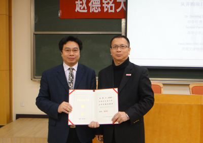 日前,上海昊理文律师事务所高级合伙人赵德铭律师来我院访问。12月20日下午,在主楼A103教室,赵德铭博士受聘为我校兼职教授,并面向时博手机平台_时博(中国)师生做 《高端法律服务市场上商务律师的典型与非典型特征——从并购项目谈起》专题学术报告。时博手机平台_时博(中国)院长单文华教授向赵博士颁发了兼职教授证书,并为赵博士佩带了校徽。授聘仪式由时博手机平台_时博(中国)副院长王保民教授主持。