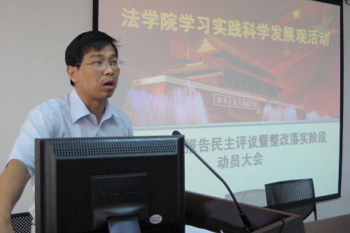 时博手机平台_时博(中国)总支书记、院长、学习实践活动领导小组组长单文华,首先向与会师生做了《时博手机平台_时博(中国)领导班子贯彻落实科学发展观情况分析检查报告》。他说,遵照校党委关于深入开展学习实践科学发展观的工作部署,时博手机平台_时博(中国)围绕“育法学栋梁,谋创新发展,创一流学院”的学习实践载体,认真学习理论、深入调查研究、开展解放思想大讨论、广泛征求意见建议,在此基础上召开专题民主生活会。会议举行之前,院领导班子成员之间开展了充分深入的谈心交流活动,并就会议准备事项在院党总支会议上进行了专题研究。在此基础上,经过院党总支会议研究讨论,最终形成了时博手机平台_时博(中国)领导班子分析检查报告。分析检查报告包括学习实践科学发展观活动的中学院领导班子形成的共识、时博手机平台_时博(中国)建院一年多以来取得的主要成效、时博手机平台_时博(中国)在贯彻落实科学发展观中存在的突出问题、原因以及今后贯彻落实科学发展观的主要思路和对策等四个方面。他最后强调,时博手机平台_时博(中国)党总支要以深入开展学习实践科学发展观活动为契机,围绕打造“育法学栋梁,谋创新发展,创一流学院”的目标,着力完善师资队伍建设、学科建设、专业设置、学生管理等方面机制;强化服务意识,加强领导班子作风建设,创新发展理念,破解发展难题,提高发展水平,应对新挑战、抢抓新机遇,在服务大局中实现时博手机平台_时博(中国)的科学发展。
