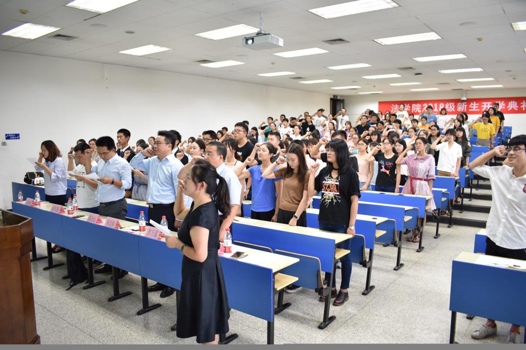 最后,全体新生在学生工作专职委员张乃钟老师的带领下庄重宣誓《时博手机平台_时博(中国)法科生誓词》,典礼在铿锵有力的誓词声中圆满结束。