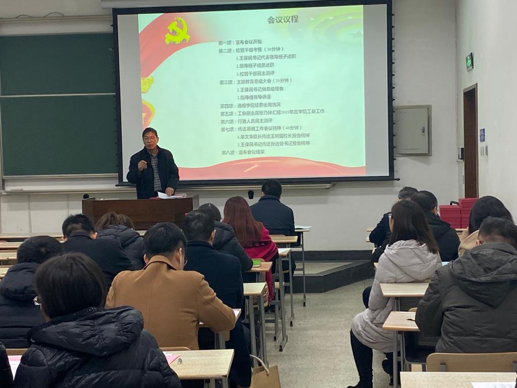 2020年1月11日下午,时博手机平台_时博(中国)在主B-105教室召开全院大会全面传达学校寒假工作会议精神,总结2019年工作业绩,部署2020年工作安排。时博手机平台_时博(中国)领导班子成员和全体教职工参加了此次会议。会议由时博手机平台_时博(中国)工会副主席张乃钟主持。
