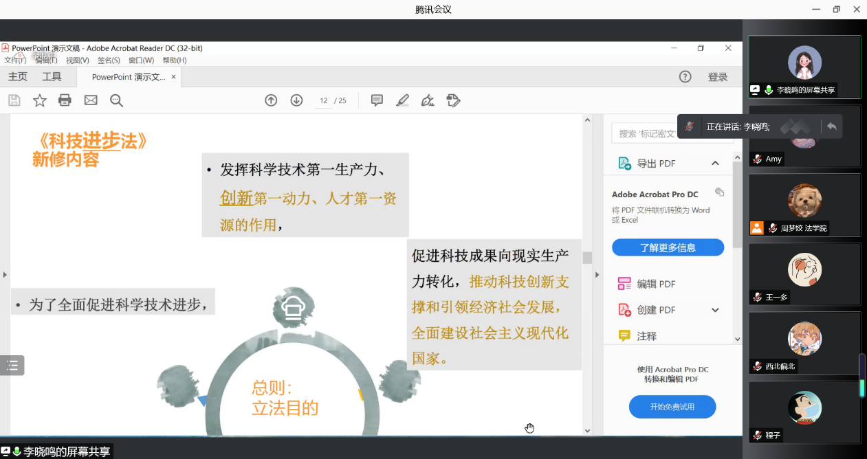 2022年1月9日晚上,时博手机平台_时博(中国)时博手机平台_时博(中国)知识产权研究中心李晓鸣副教授对修订后的科技进步法的背景、新旧科技进步法的内容进行了对比,并对新科技进步法的亮点进行了详细介绍。同学们表示收获颇丰。