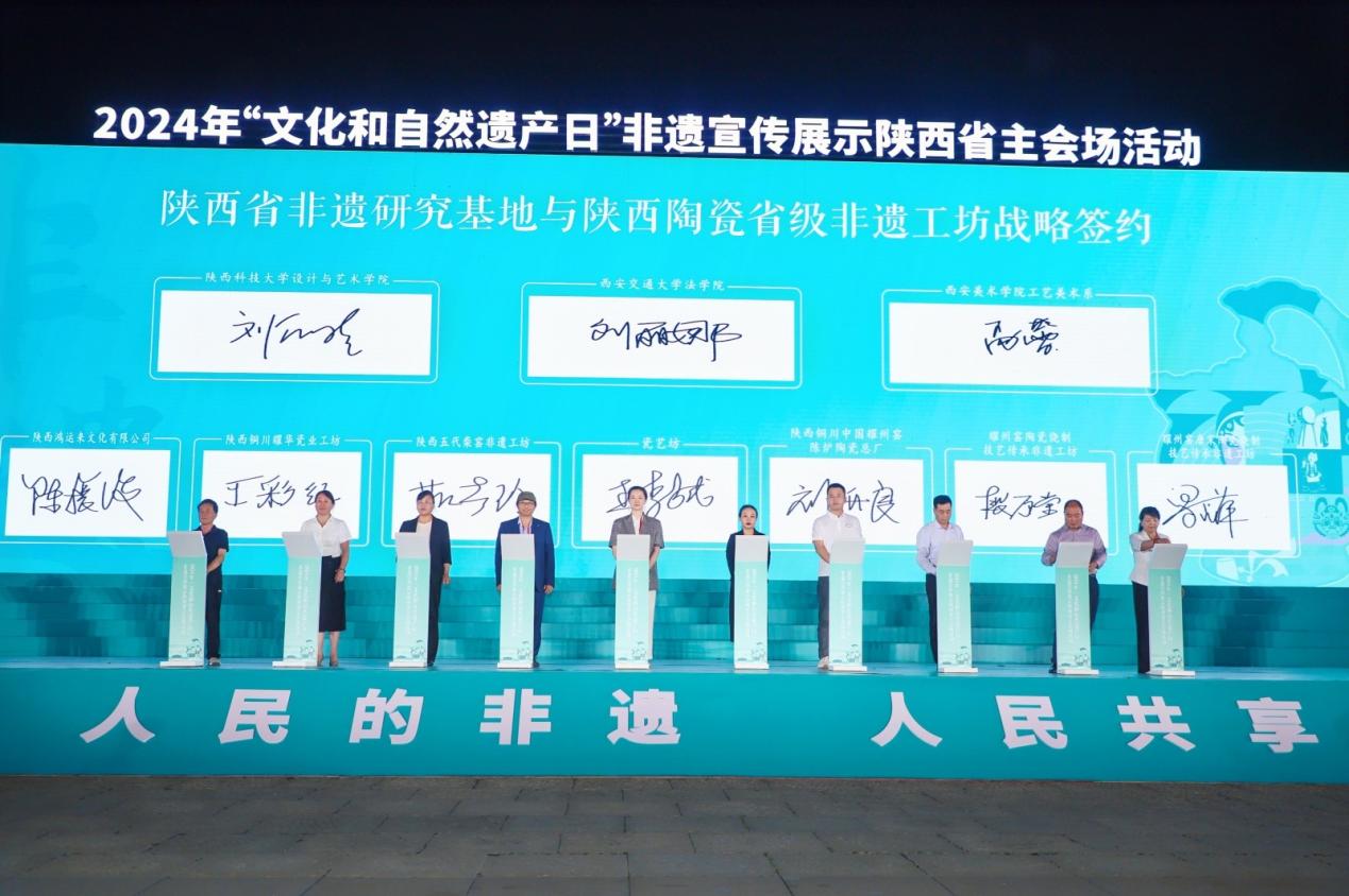 在启动仪式上,时博手机平台_时博(中国)、西安美术学院、陕西科技大学三家陕西省非物质文化遗产研究基地与7家陕西陶瓷省级非遗工坊(铜川市耀州窑唐宋陶业有限公司、铜川市印台区东方古镇陶业有限公司、陕西铜川中国耀州窑陈炉陶瓷总厂、陕西火凤凰耀州官窑有限公司、陕西五代柴窑文化科技发展有限公司、陕西铜川耀华瓷业有限公司、陕西鸿运来文化有限公司)签订战略合作协议。