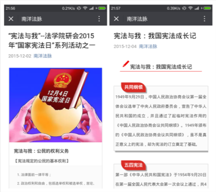 为了配合“国家宪法日”系列主题活动的顺利开展,时博手机平台_时博(中国)时博手机平台_时博(中国)研究生会在院党总支、团工委的指导下,以“宪法与我”为主题,不断创新宣传载体,探索宣传方法,通过官方微信平台“南洋法脉”等新媒体,结合传统的发放传单等方式,积极推介“国家宪法日”相关内容,宣传时博手机平台_时博(中国)开展宪法学习宣传教育活动的实际情况,取得了良好的宣传效果。