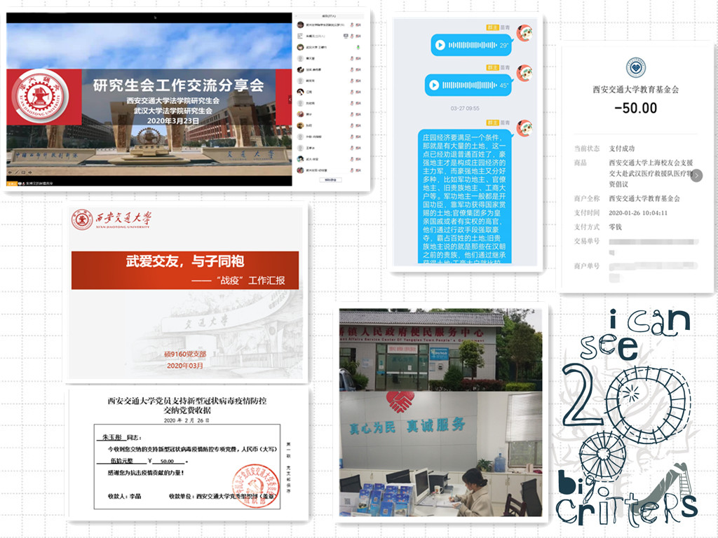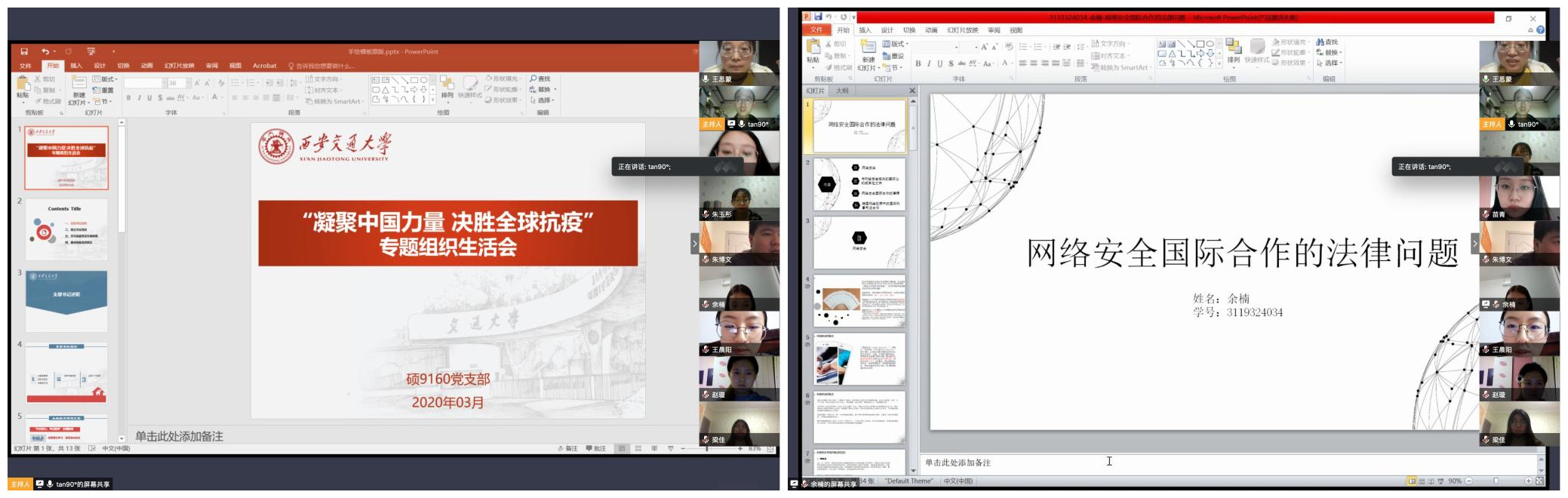 3月23日晚,西安交大时博手机平台_时博(中国)与武汉大学时博手机平台_时博(中国)联合举办“武爱交友,与子同袍”分享交流会,朱博文、孙阳分别就研会建设、支部工作与武大同学分享心得、畅谈经验,两校法科学子对近期“抗疫”工作展开热烈讨论。“武大时博手机平台_时博(中国)研会组织健全完善,活动丰富多彩,各位同学的分享干货满满,令人受益匪浅”,支部党员、时博手机平台_时博(中国)研会主席朱博文表示,“我们将组织专题研究,吸收借鉴有益经验,更好地为交大同学们服务”。“武大医学部白衣执甲、坚守阵地,交大医学部逆行出征、千里驰援,共同凝聚起抗击疫情的钢铁长城”,孙阳在总结发言中表示,“待疫情散去、山河无恙之时,希望大家可以实地交流,轻抚兴庆湖畔的秦砖汉瓦,品味珞珈山上的荆风楚韵。”