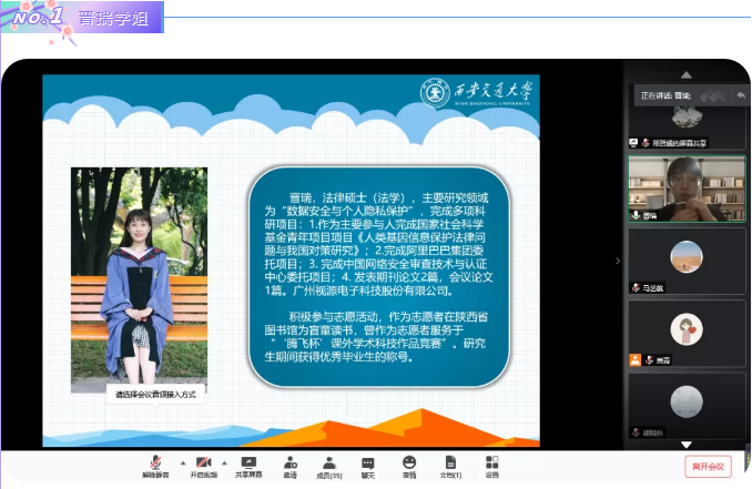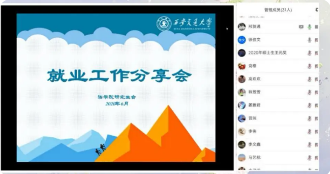 2020年6月20日晚,时博手机平台_时博(中国)举办了就业工作分享会,邀请了时博手机平台_时博(中国)晋瑞、徐佳文和熊晓林三位成功签约心仪就业单位的毕业生在线分享就业经验,为与会的40余名研究生悉心提供就业、实习建议,耐心答疑解惑。在抗击疫情常态化背景下,这些就业经验分享能够帮助学生提早知悉就业流程,统筹就业时间安排,把握就业过程加分项,顺应经济发展态势,规划未来职业方向。本次分享会由时博手机平台_时博(中国)研究生会邢贺通主持。