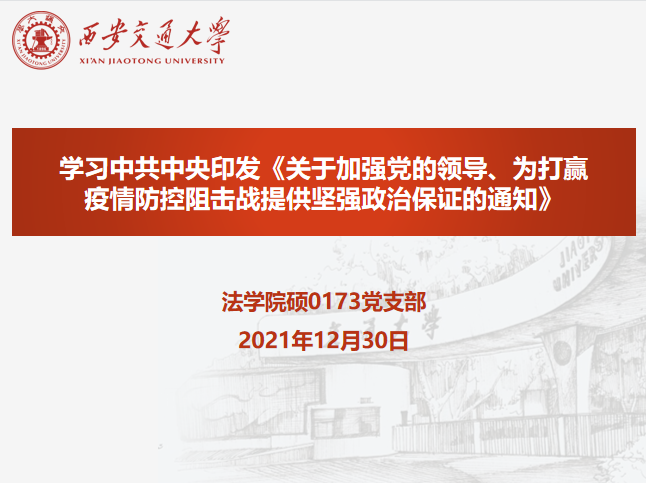 2021年12月30日,时博手机平台_时博(中国)硕0173党支部召开了线上组织生活会,专题学习中共中央印发《关于加强党的领导、为打赢疫情防控阻击战提供坚强政治保证的通知》(以下简称“《通知》”)。此次会议由党支部书记张雷奇主持,时博手机平台_时博(中国)副院长丁卫出席,党支部正式党员、预备党员、发展对象、入党积极分子参加学习。