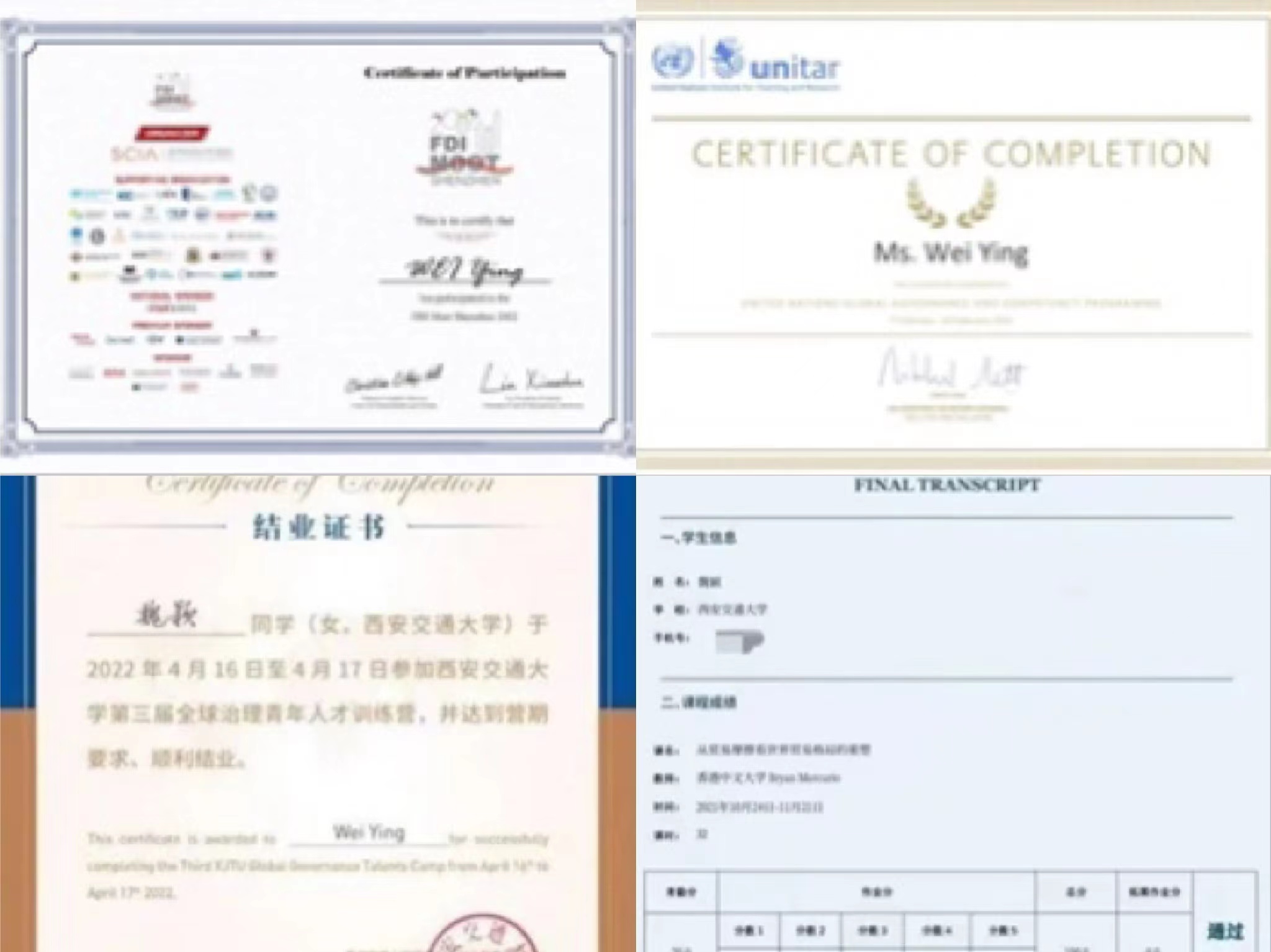 在联合国寒假实习项目中,她曾与众多国际组织官员交流学习,以Merit成绩通过考核,也曾代表学院参加由国内外知名仲裁员担任评委的全英文国际投资仲裁模拟法庭竞赛。此外,还参加了两门由香港中文大学的Bryan教授与牛津大学的Liam教授授课的全球治理全英文课程,分别以100分即满分与96.8分结课。同时她还积极参加全球治理人才训练营,获得三等奖。